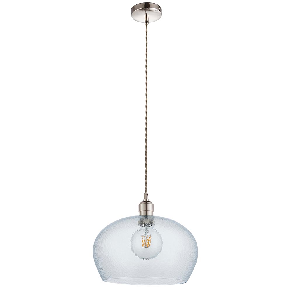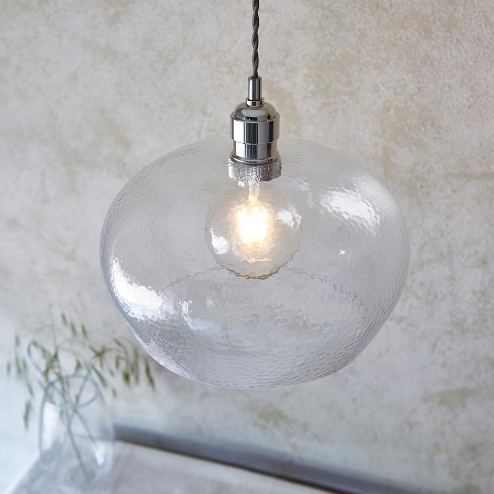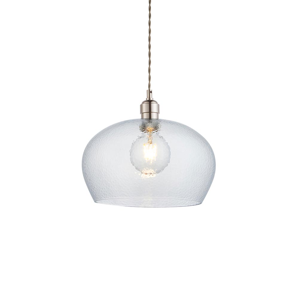 John Pendant. This highly versatile timeless clear glass pendant works equally well in a contemporary or classic setting thanks to its bright nickel finish, hammered glass and refined design; perfect for open plan living. Matching items are available