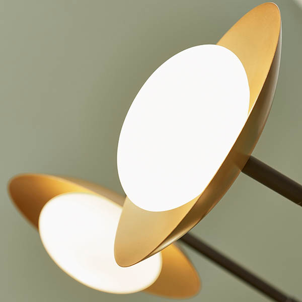 Karen Semi Flush. A distinctive large ceiling light, comprising of recognisable shapes combined with minimal design. With inspiration from Mid-Century style, finished in gold and bronze with pebble-shaped opal glass shades. Combine with the table and floor light from the same range for a co-ordinated look.