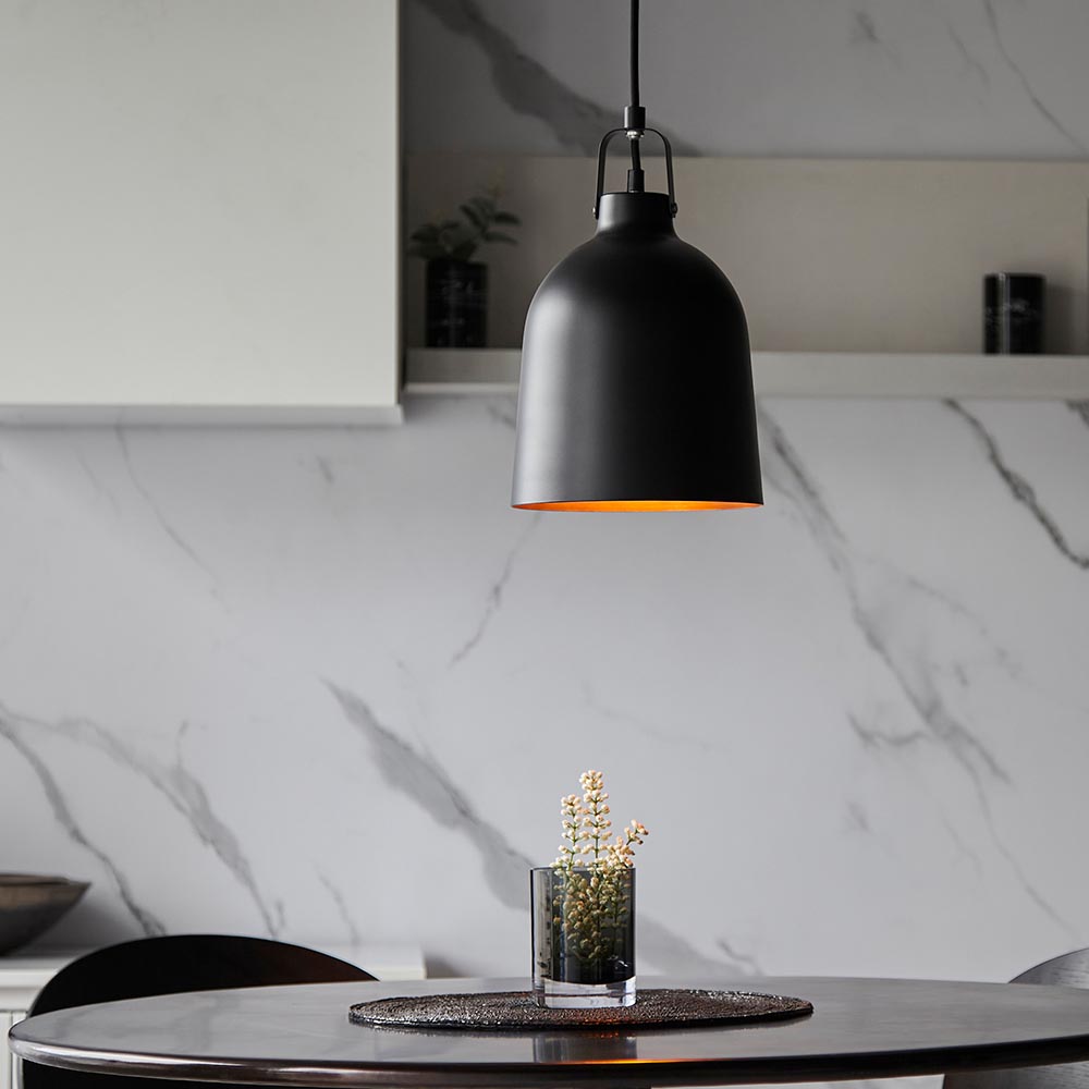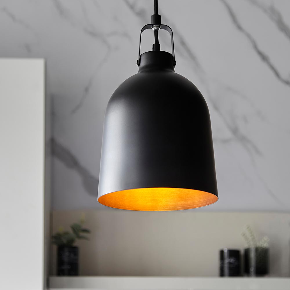 The strong silhouette shape of this E27 pendant is a nod to industrial design style. Finished in matt black and featuring a subtle modern bracket detail, with complementary pewter finish inside the shade. This pendant is ideal when placed in a modern open plan kitchen and dinning space, individually or in multiples, for creating an on-trend contemporary modern living look. Matt black industrial style pendant Aged pewter finished inner shade Height adjustable 1.2 metre black fabric flex Dimmable Perfect for use with E27 LED lamps
