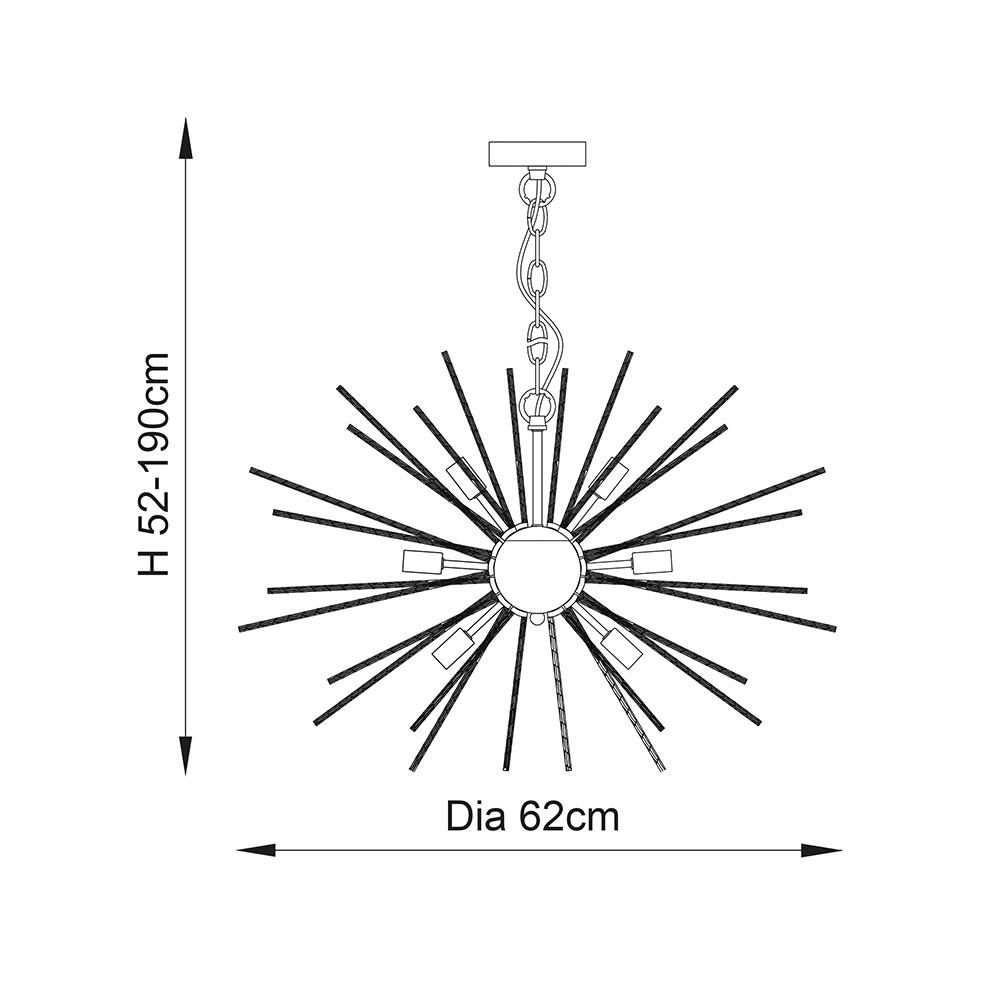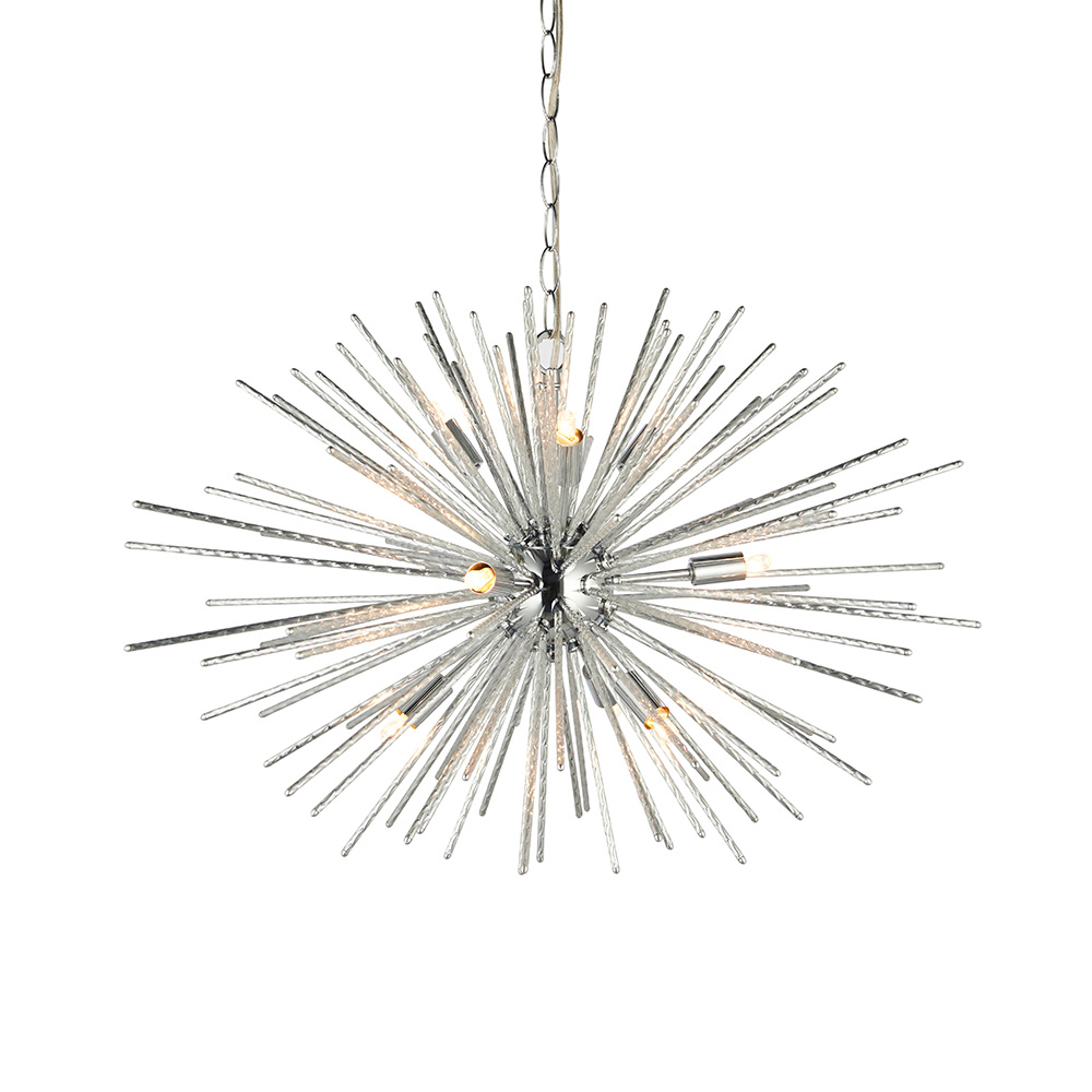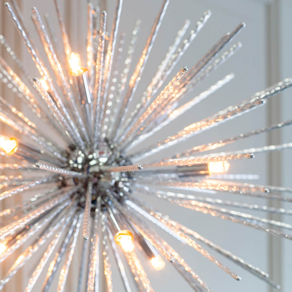 A modern version of a timeless classic from the past, finished in polished chrome featuring an ‘explosion’ of textured rods that create dramatic light patterns. Suspended from a height adjustable chain with clear flex, be brave and add this to modern or classic interiors to achieve that ‘WOW’ look… A modern timeless classic pendant Star burst of polished chrome rods Height adjustable 1.5 metre chain with clear cable Dimmable Compatible with G9 LED lamps