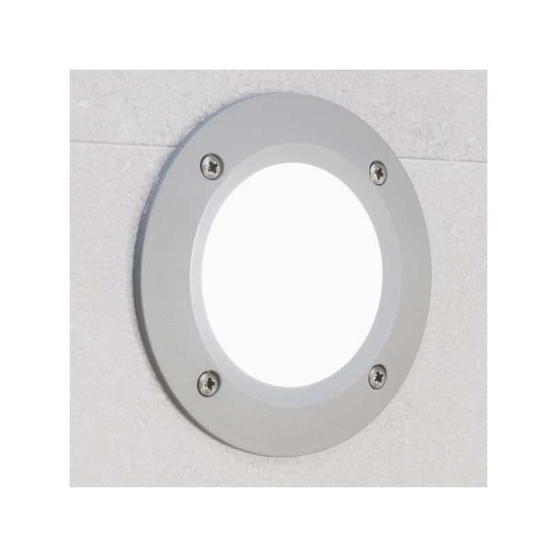 Round recessed wall fitting, with plain grey cover and opal diffuser made in shockproof resin material, UV rays stabilised, rust and corrosion free. Supplied as standard with long life powerful and efficient TÜV approved GX53 3W LED lamp. Recessed Body Opal PMMA Diffuser Shock Proof Resin Material UV Rays Stabilised body 1 x 3watt 4000K 350Lm GX53 LED Lamp included