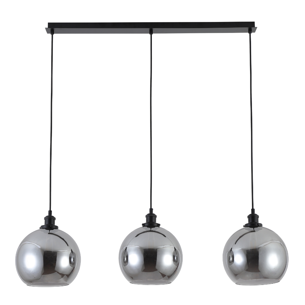 Simplistic spherical shaped smoked glass shades with exposed lamp hanging from matt black bar, ideal for hanging over a kitchen island to create the perfect setting. The Lewis has a decorative matching matt black braided flex and exposed screws to give an industrial, vintage styling.