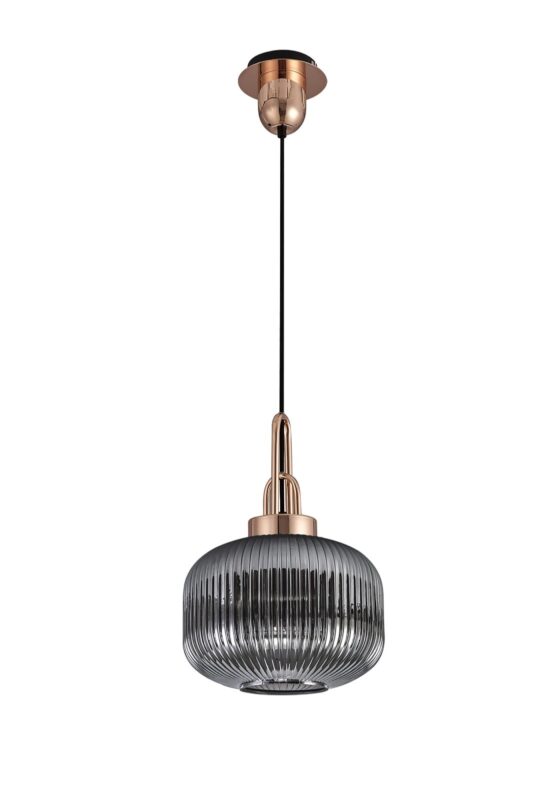 Luxora 1 Light Pendant E27 With 30cm Pumpkin Shaped Ribbed Glass, Smoked Copper/Matt Black Luxora provides a group of E27 suspension kits with a more intricate frame design available as a single, 3 light or 4 light pendant in a variety of colours. In union with these kits, this range also includes a selection of metallic tinted glass cylinders and globes finished in either a brass gold, copper or smoked colour which can be used to complement the pendant kits for a generic fixture or produce a mixed tone effect for something more bespoke. As a more traditional option there are also ribbed style glass to choose from.