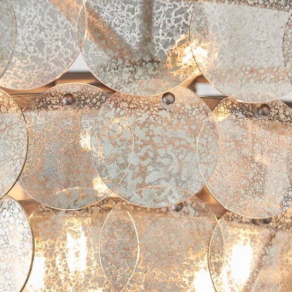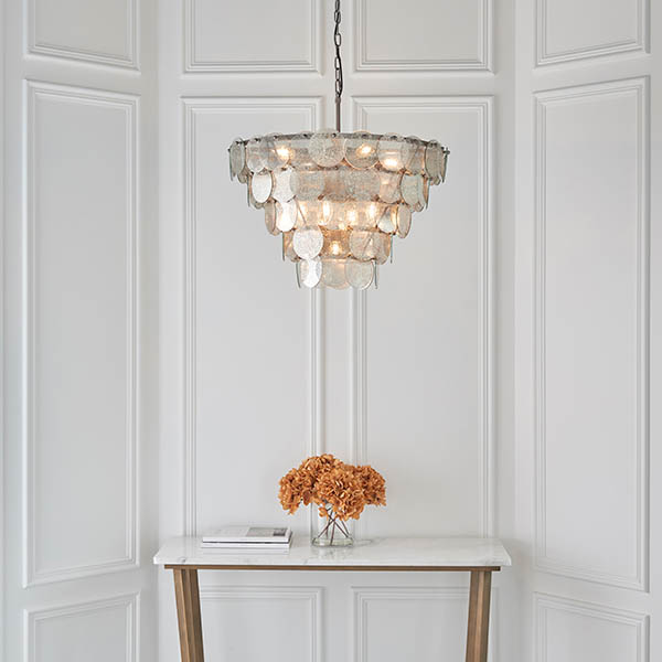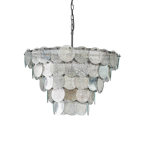 Maude Pendant. Create an ethereal presence with this exquisite chandelier featuring tiered layers of mercury glass discs. With an adjustable, antique silver chain and nine dimmable lights, this striking centrepiece is the perfect finishing touch. Pair with matching items from the range.
