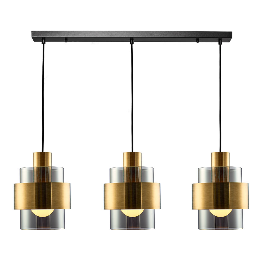 MELA PENDANT RANGE n nBRUSHED BRASS & SMOKE GLASS PENDANT FITTING n nH min320 max1300 x L850mm X W180mm n nWattage 3 x E27