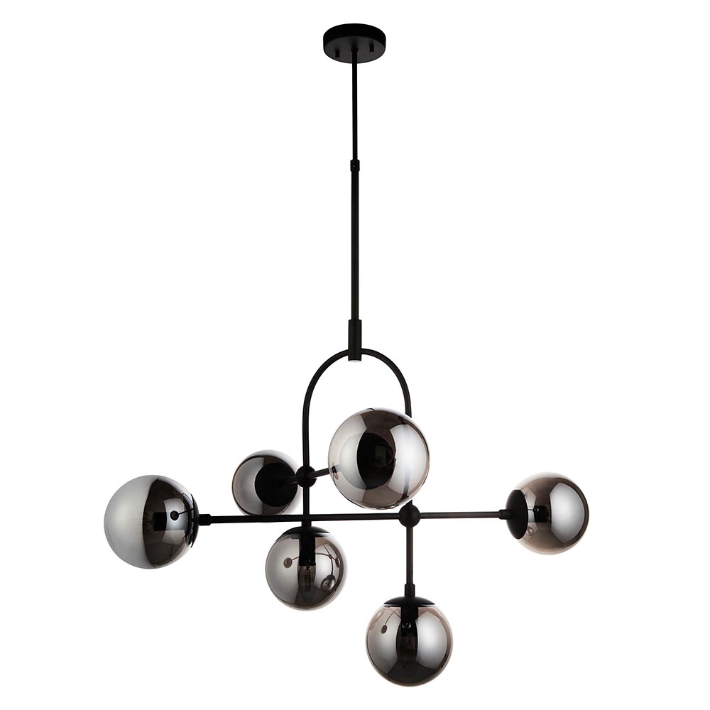 Milton Multi Pendant.  Inspired by Mid-Century design, this ceiling light makes a bold statement. Combining both curves and straight lines, this fitting features an matt black finish twinned with smoked mirror glass sphere shades. Matching items are available.