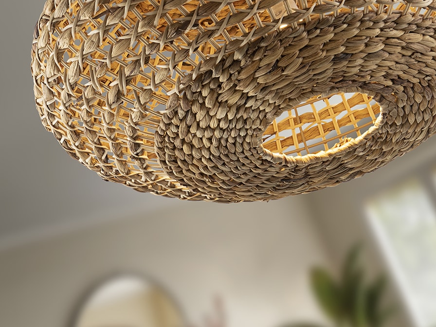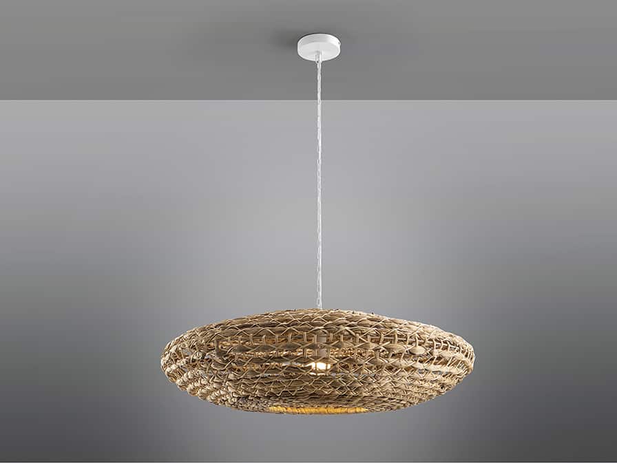 The Nana Rattan Pendant, 80cm, is intricately woven with rattan fiber and braided water hyacinth.