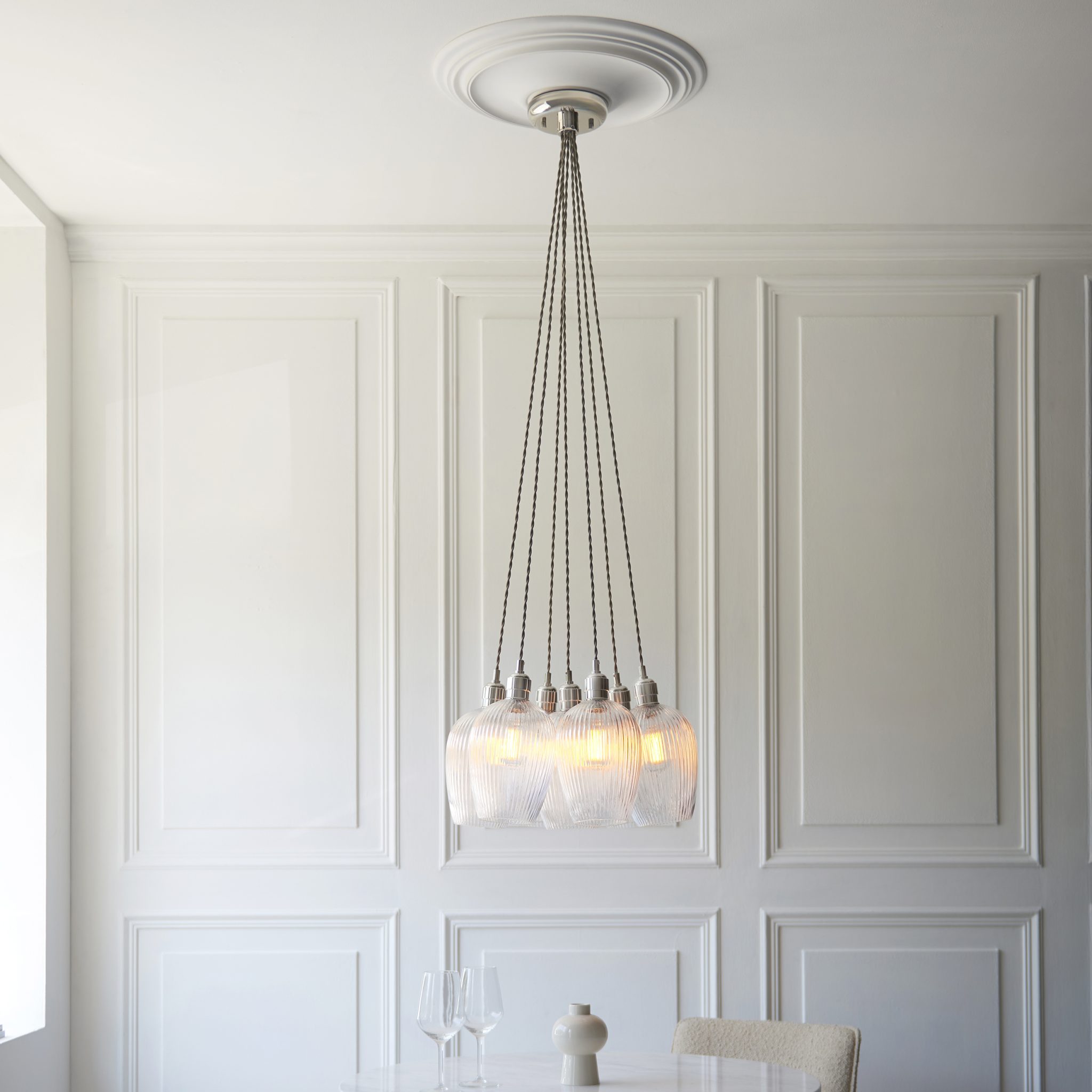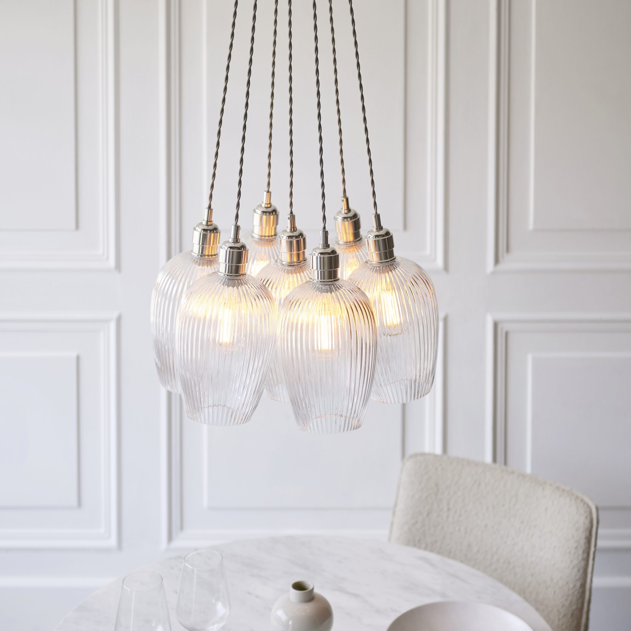 With two height-adjustable twisted grey fabric cables (up to 1 metre), Nettie sits perfectly over a kitchen island, dining table, or in an open-plan living space, creating a balanced statement that still feels airy. Pair it with E27 LED filament bulbs to lean into that “on-trend” glow and show off the glass properly.
