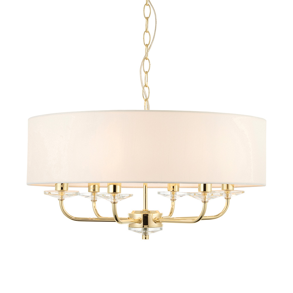 The Nixon 6-light ceiling pendant is finished in a brass effect plate. The arms are complemented with a touch of crystal and the fitting is topped with a narrow, vintage white, faux silk shade. Height is adjustable, and the fitting is dimmable and suitable for use with LED lamps. Matching items available Dimmable Brass plate & vintage white fabric Constructed from steel & fabric & crystal glass