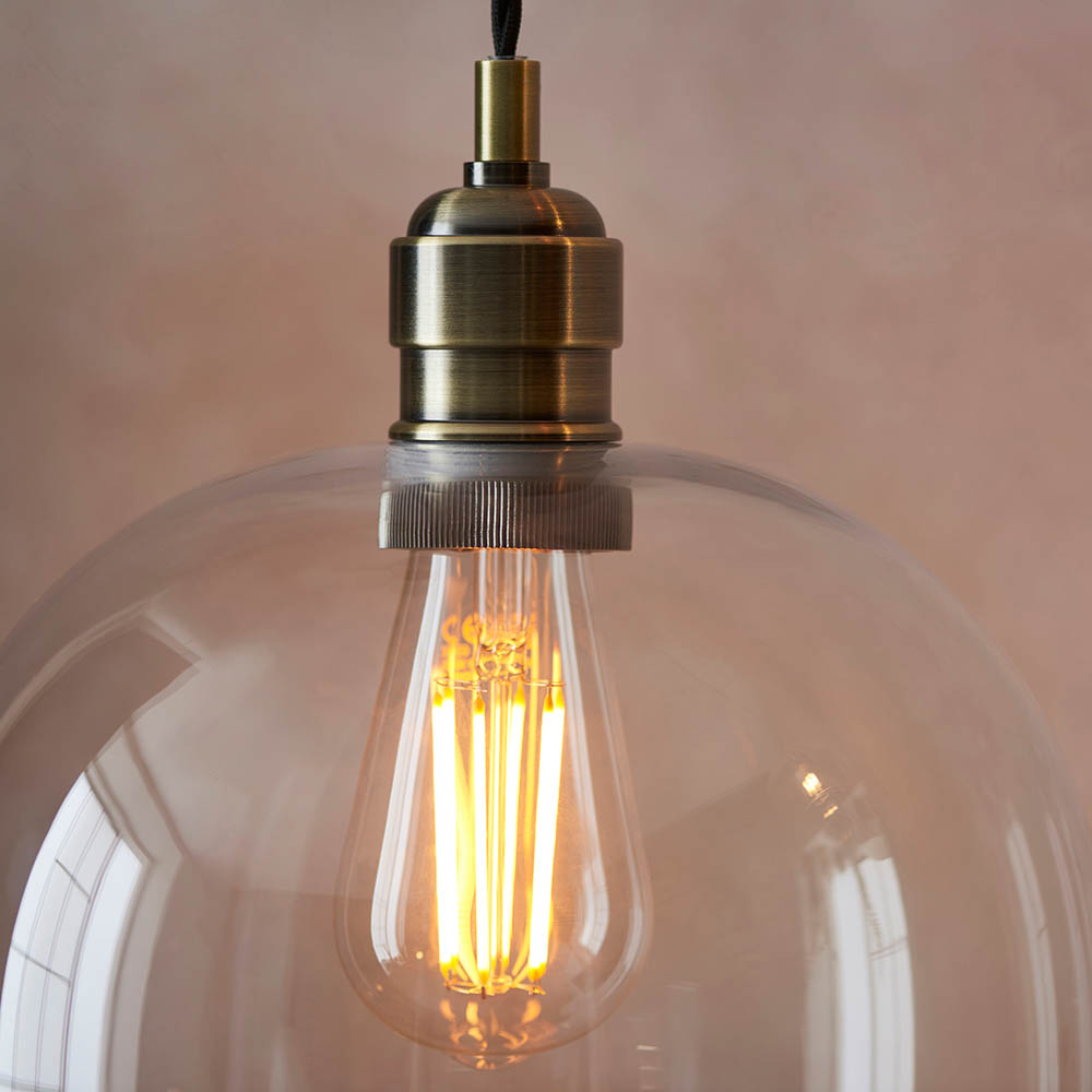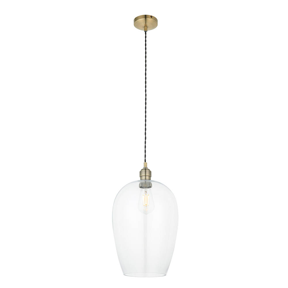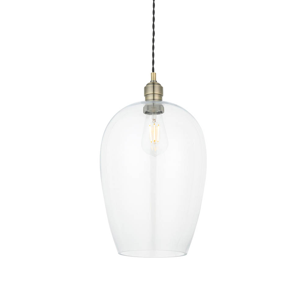 Nora A/B Pendant. This highly versatile timeless clear glass pendant works equally well in a contemporary or classic setting thanks to its antique brass finish and refined design. Perfect for open plan living. Matching items are available.
