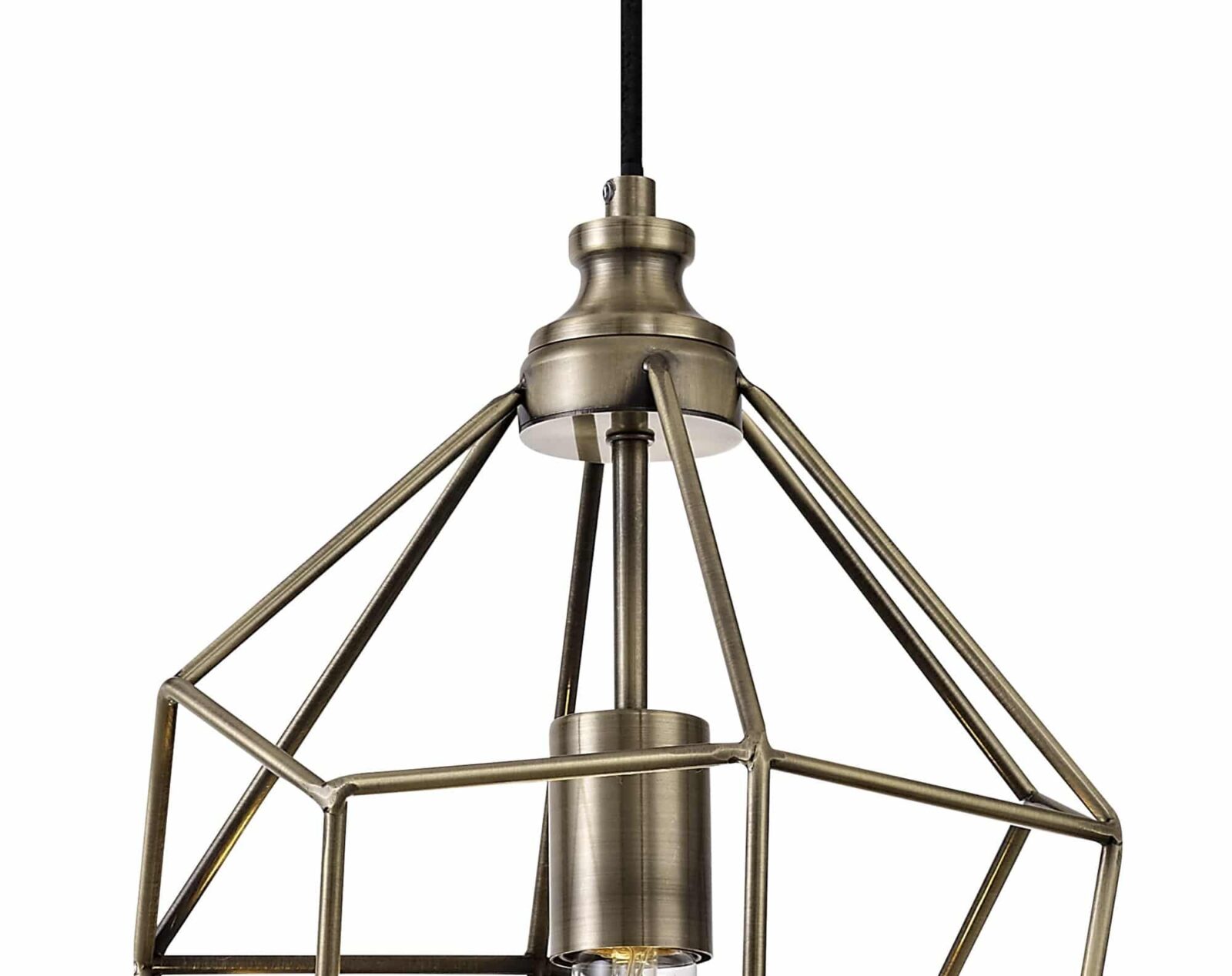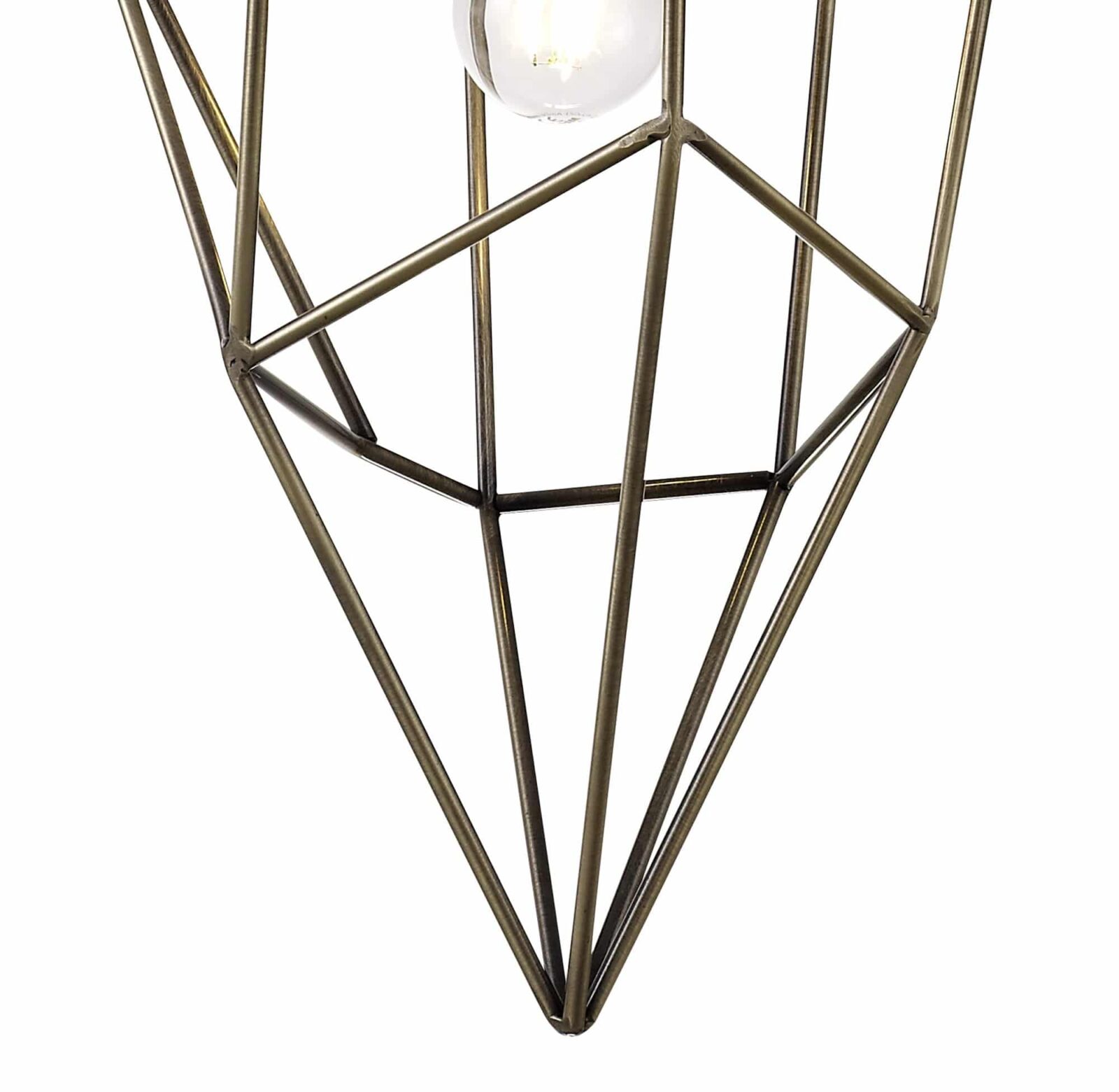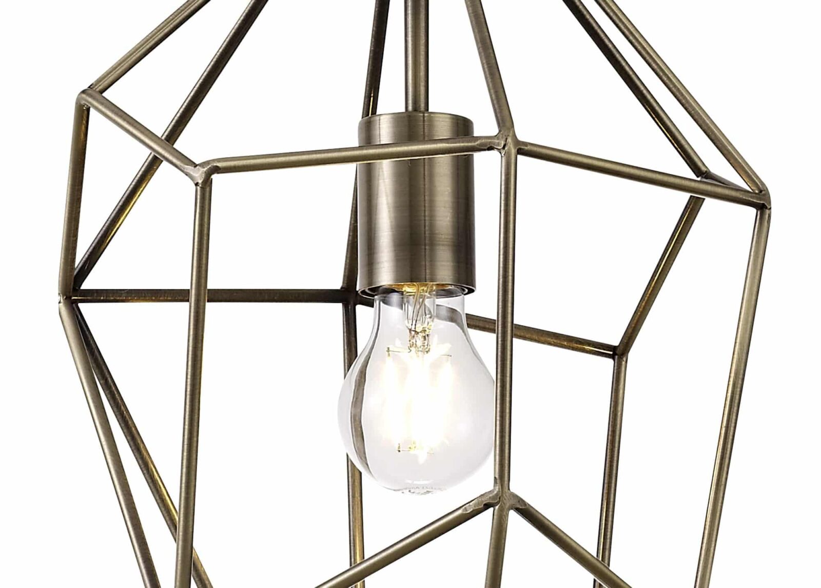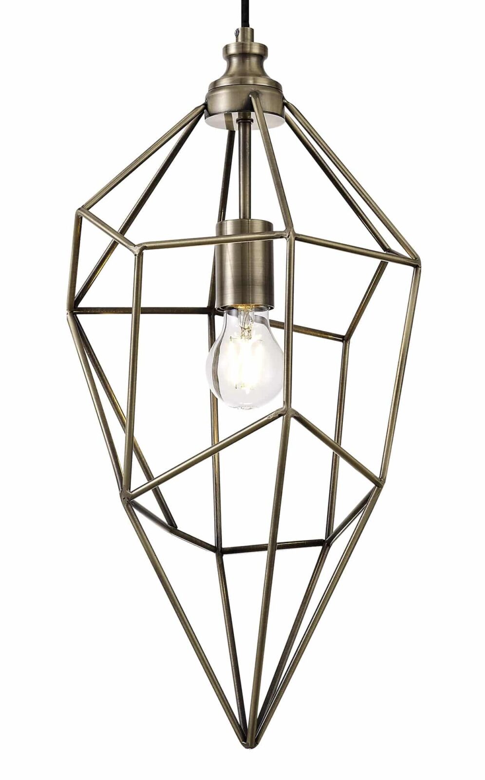Olly Large Pendant, 1 x E27, Antique Brass The open areas of the Olly single pendants form an uninhibited ambient distribution. Numerous different irregular shapes form the metal framework in black nickel or antique brass producing an overall acorn shape with distinctive narrow angled point. Available in three size these E27 pendants are sure to complement a modern edgy setting.