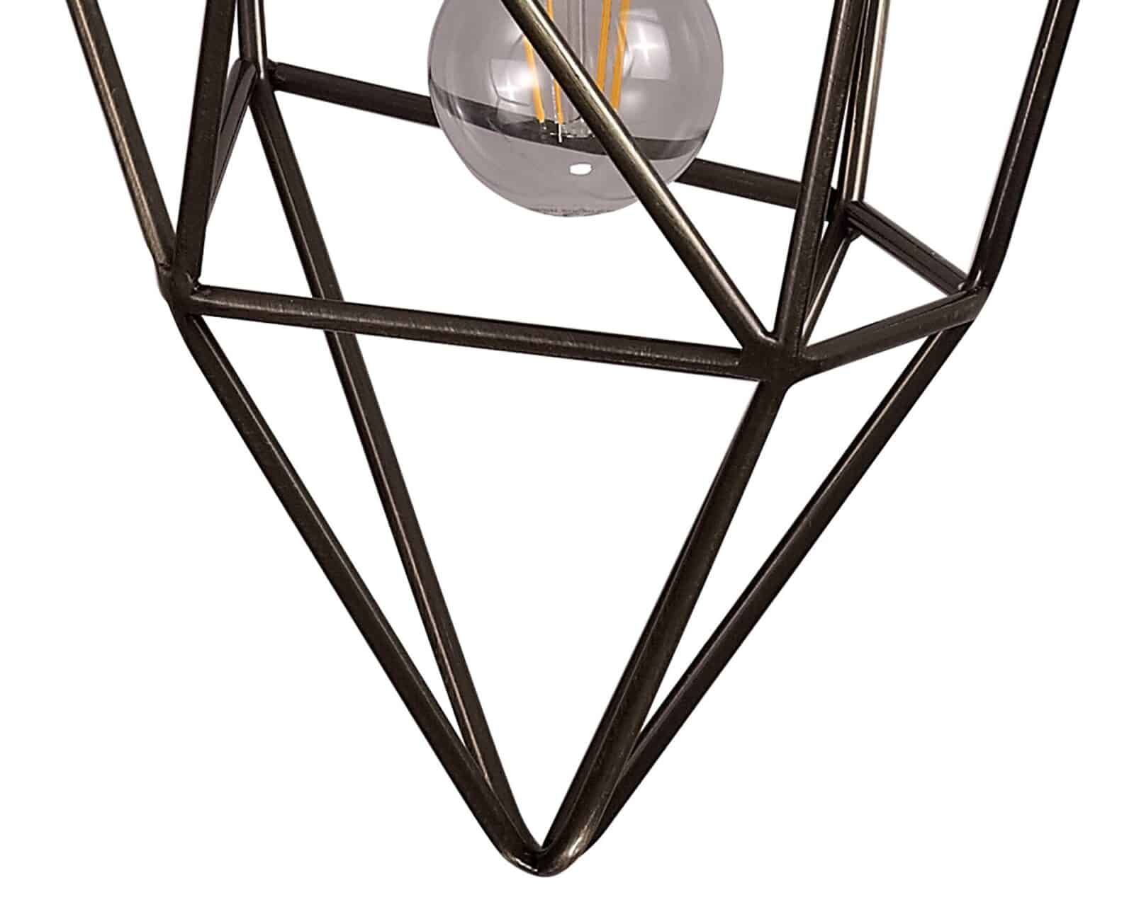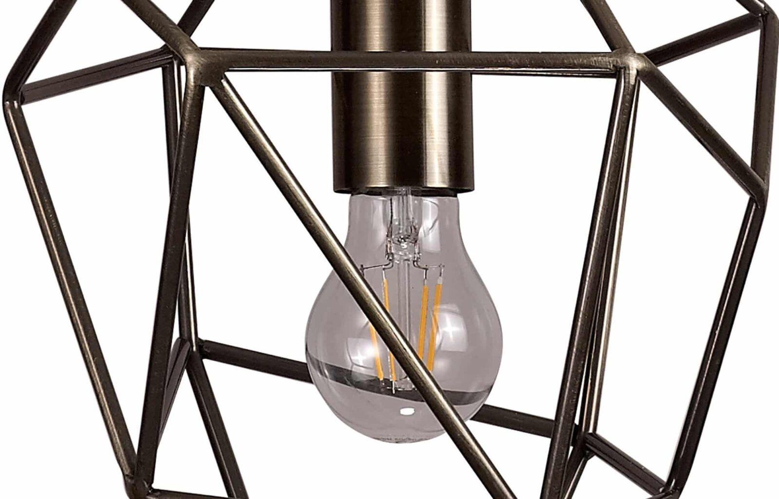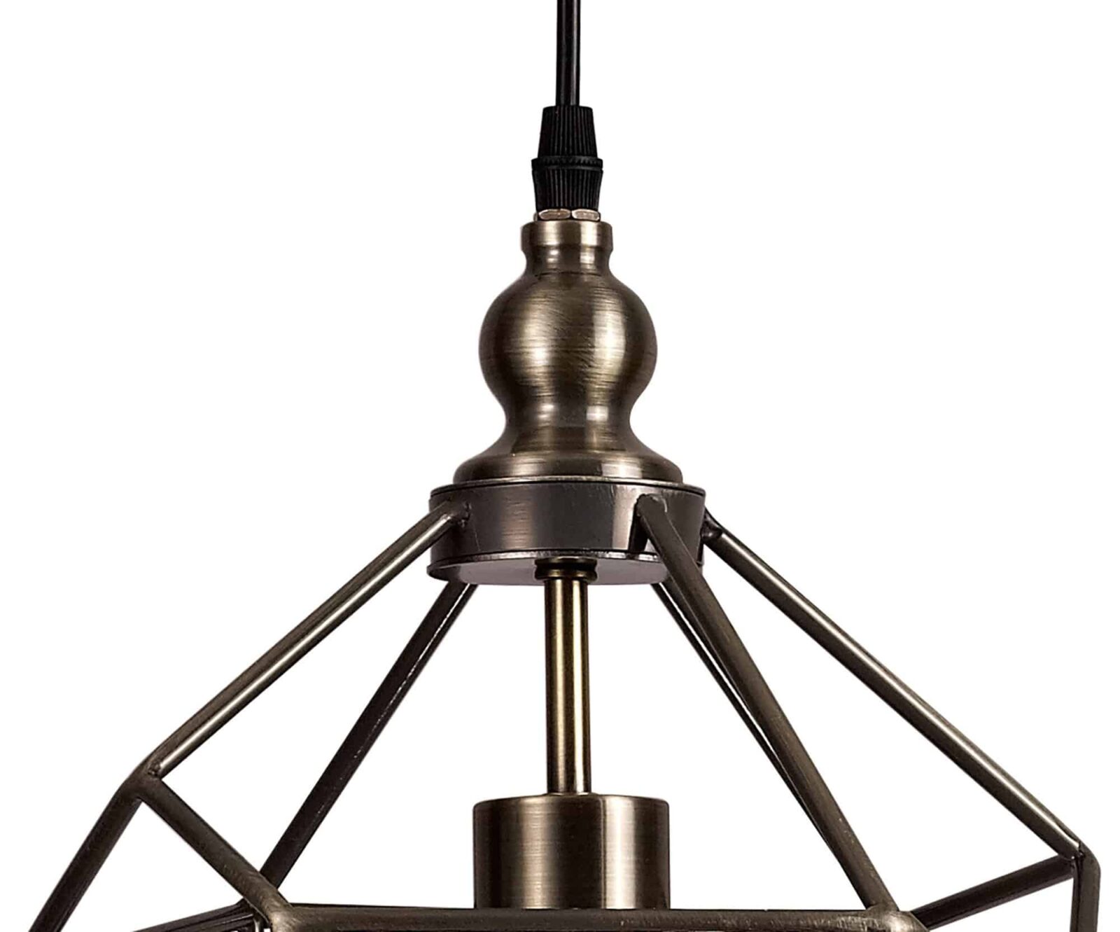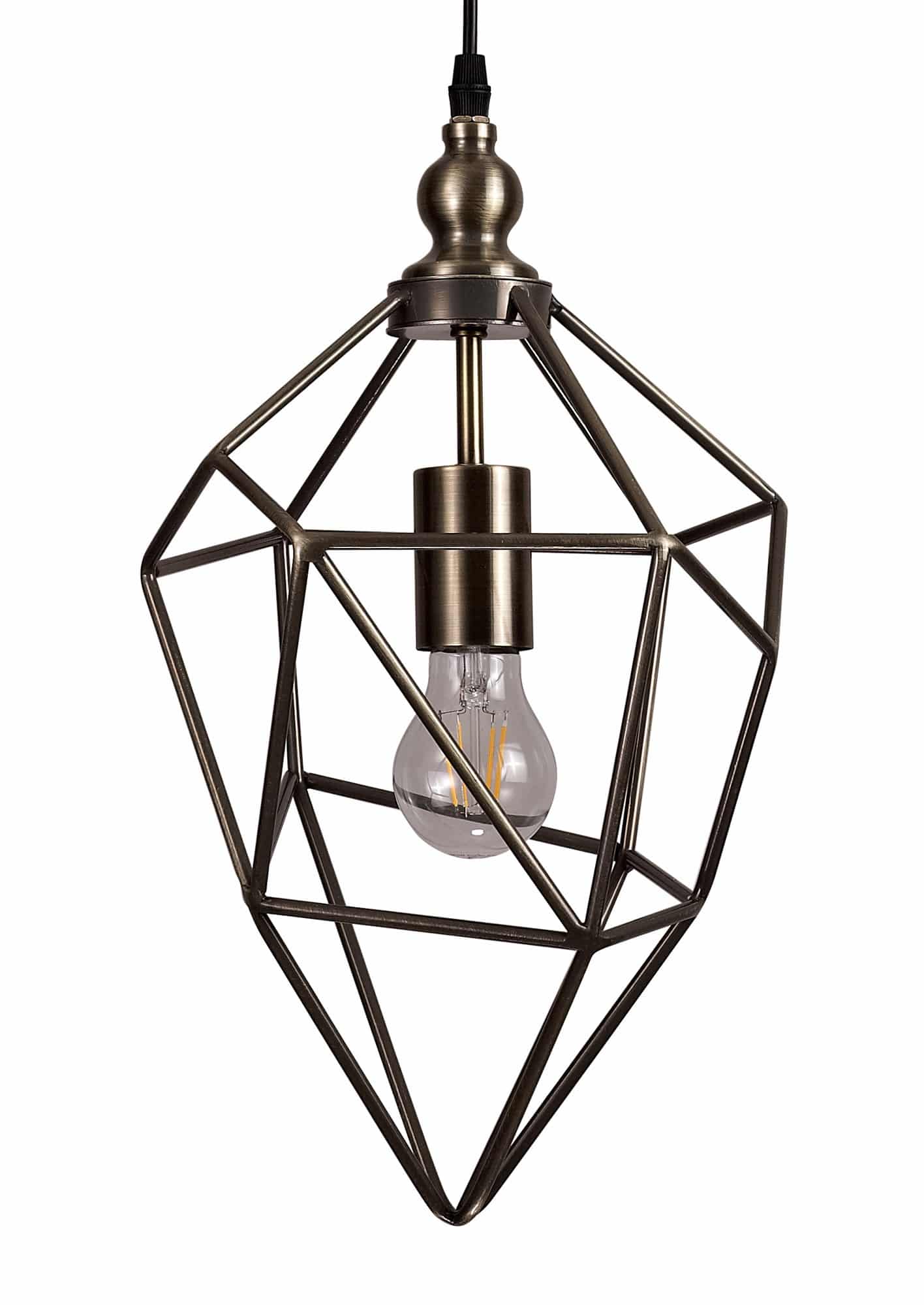 Olly Medium Pendant, 1 x E27, Antique Brass open areas of the Olly single pendants form an uninhibited ambient distribution. Numerous different irregular shapes form the metal framework in black nickel or antique brass producing an overall acorn shape with distinctive narrow angled point. Available in three size these E27 pendants are sure to complement a modern edgy setting.