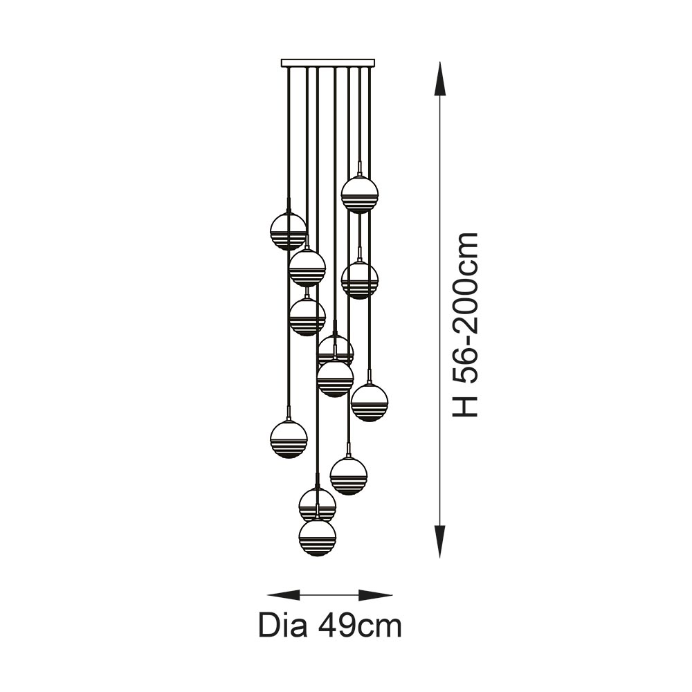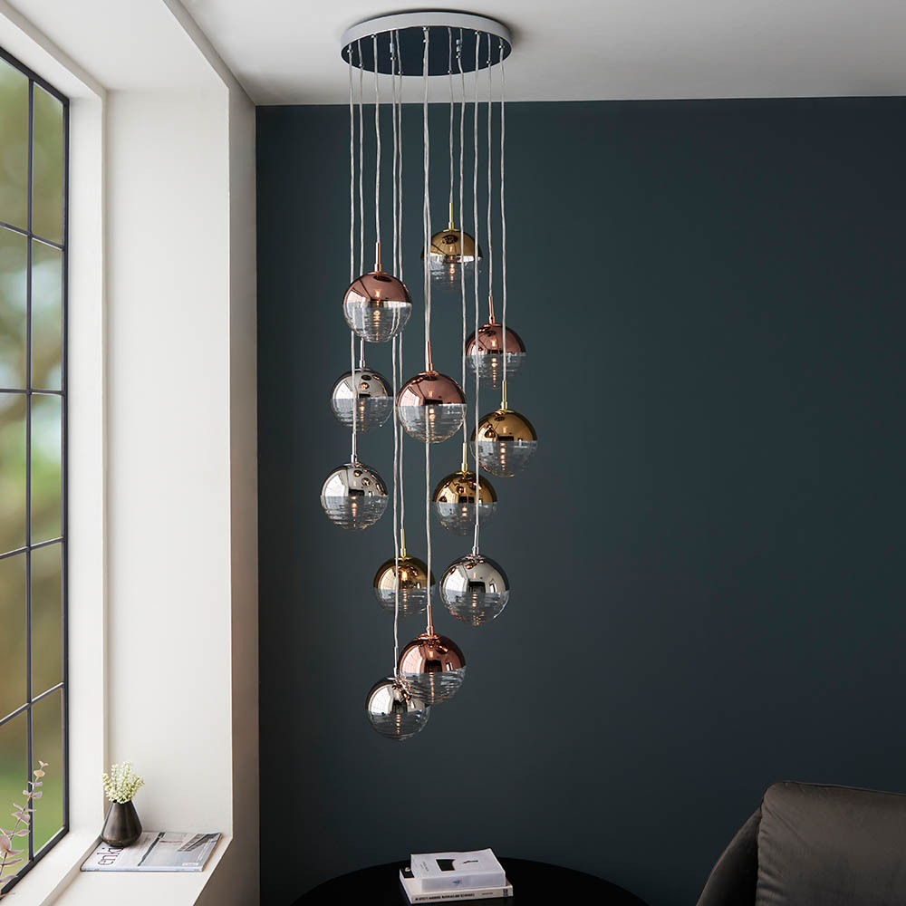 Adorn your ceiling with this stunning metallic cluster pendant. With adjustable length cable create a cascade of stylish modern illuminations to bring texture and personality to your interior. Elegant multi coloured cascading glass pendant Polished chrome plated finish Spherical chrome, copper & gold clear ribbed glass shades Height adjustable clear flex Dimmable Perfect for use with G9 LED lamps