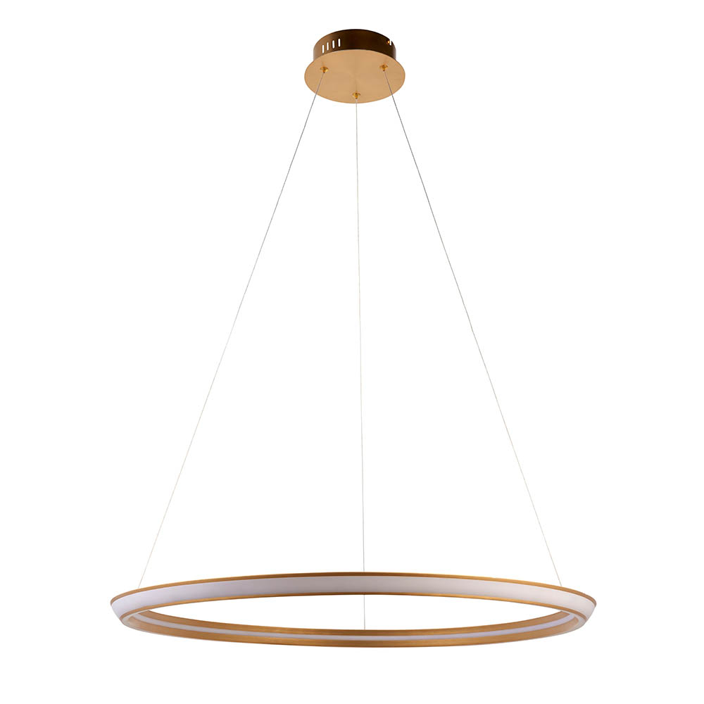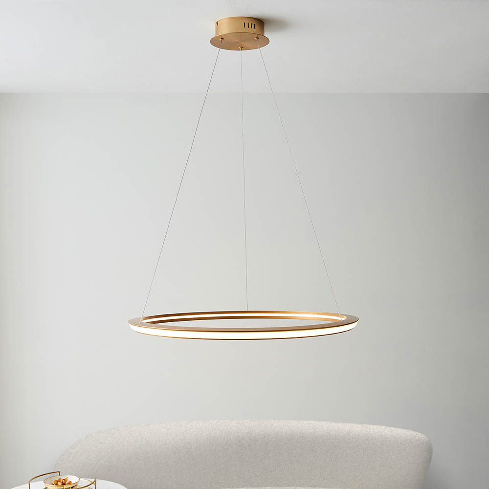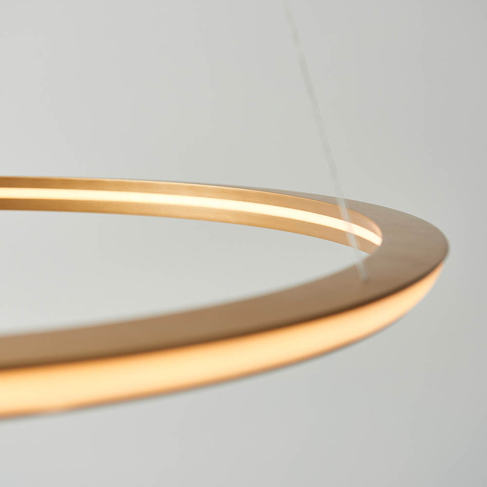 Create a halo effect with this minimal but highly impressive, contemporary pendant. A single, satin gold hoop of light is suspended from near-invisible height adjustable cables.