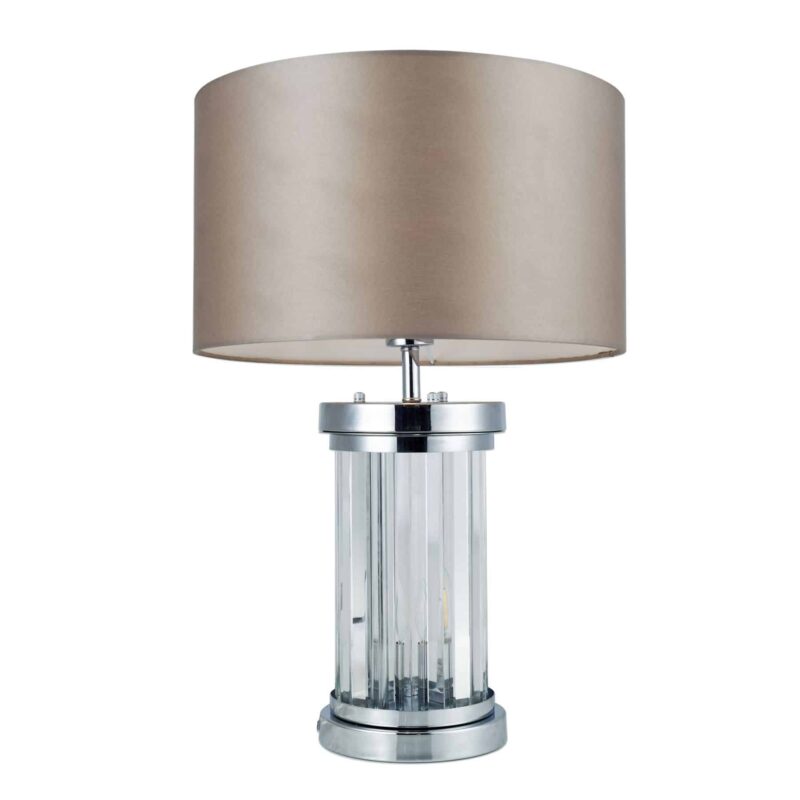 The Pandora 2 Light Table Lamp in Polished Chrome is a statement piece comprising of sparkling crystal bars encased in polished chrome bands.  It is a match for the very popular Pandora Collection of ceiling lights. The elegant band of crystal reflects the light beautifully when illuminated for a glamorous lighting effect. It has two illuminating parts; inside the crystal lamp centre and also inside the material shade. The Pandora Table Lamp is fully LED Compatible.