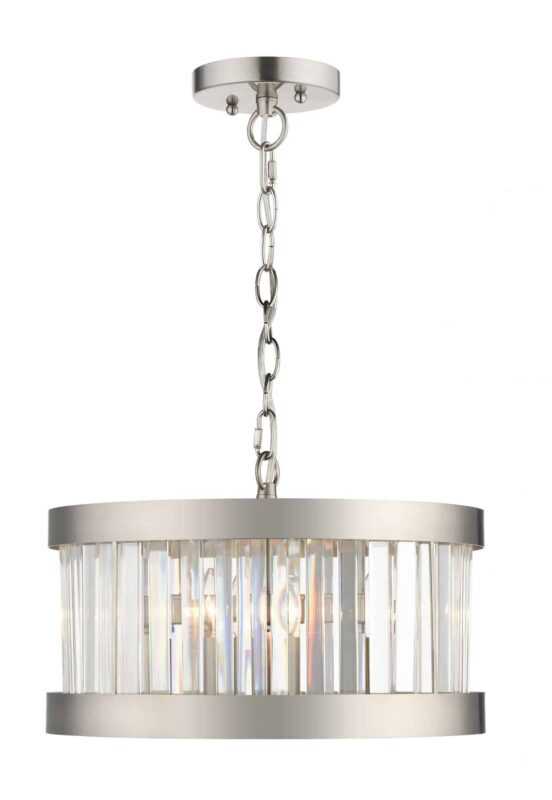 Make a bold statement with the Pandora 3 Light Round Pendant in Satin Chrome. This fixture boasts a beautiful design, featuring sparkling crystal bars elegantly encased within two thick Satin Chrome bands. The combination of crystal and Chrome creates a contrast, adding a touch of glamour and sophistication to any space.