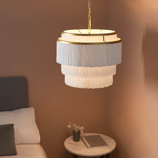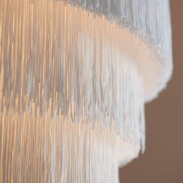 Pearl Pendant. This stunning pendant features cascading layers of white tassels. With an adjustable chain, this ceiling light is the perfect way to add interest to your interior. Available in matt gold and polished chrome finish.