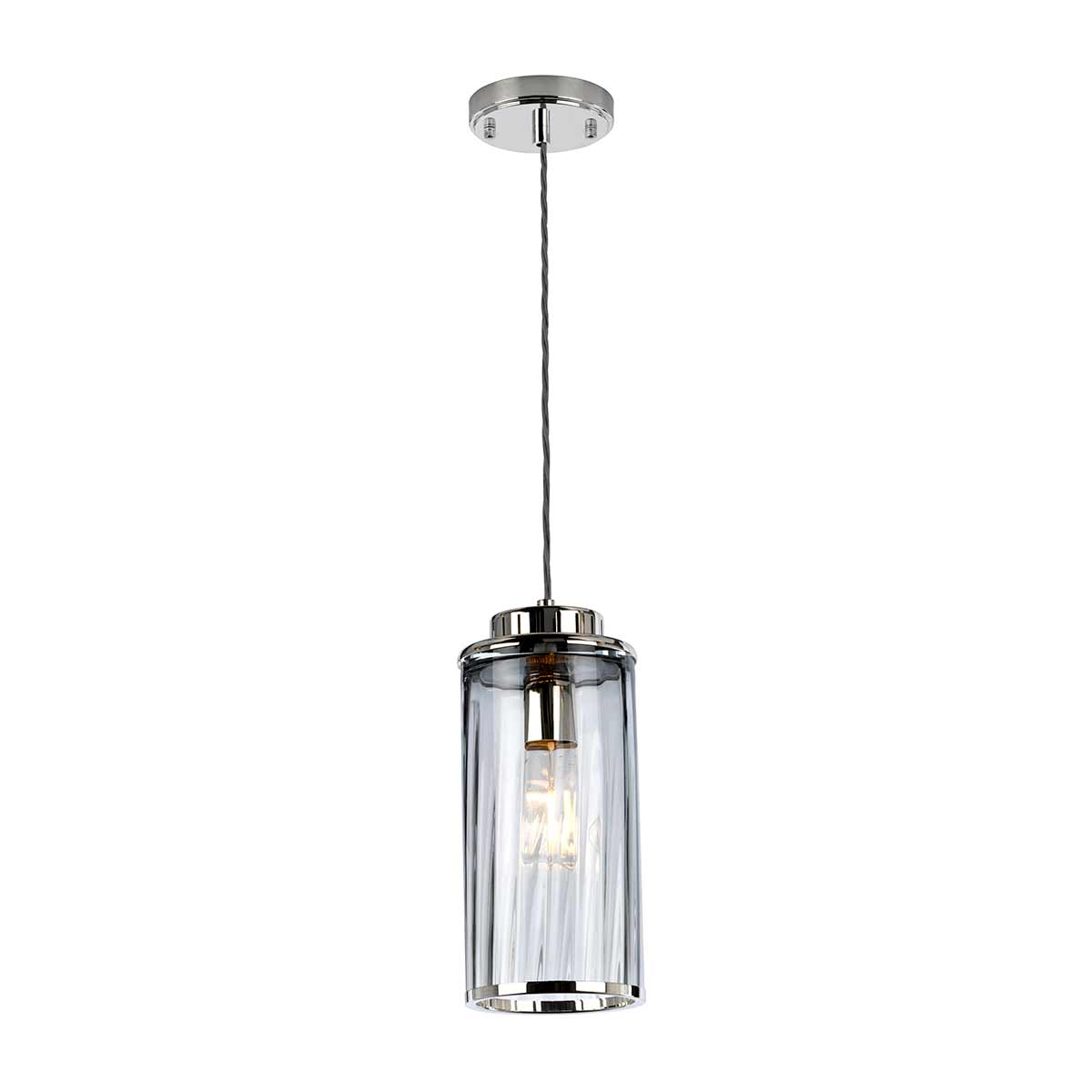 The Reno pendant has an obelisk style mouth-blown optical glass shade that has a smoke tint. The classy polished nickel metal fixings on the elegant glass tempers its more masculine detailing.
