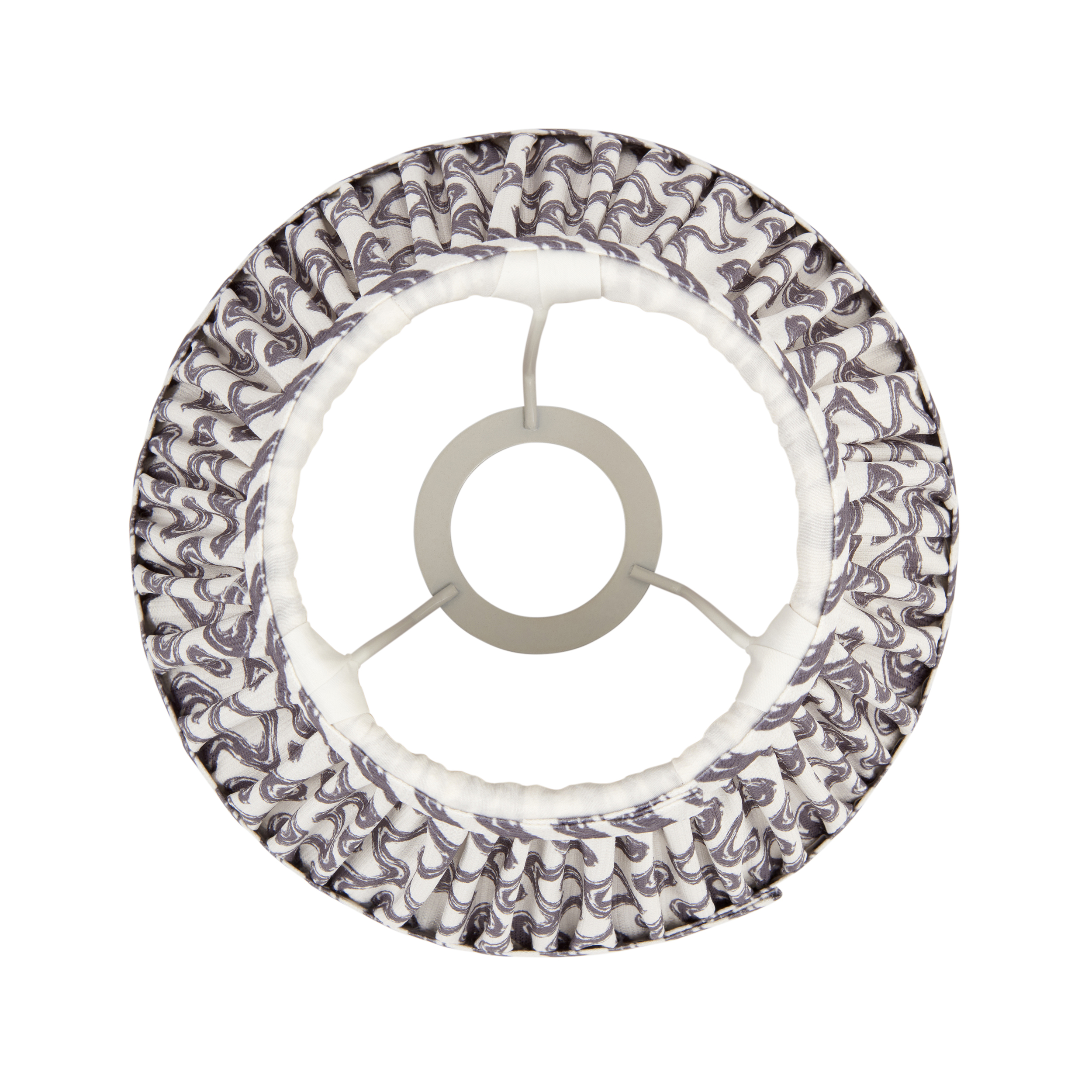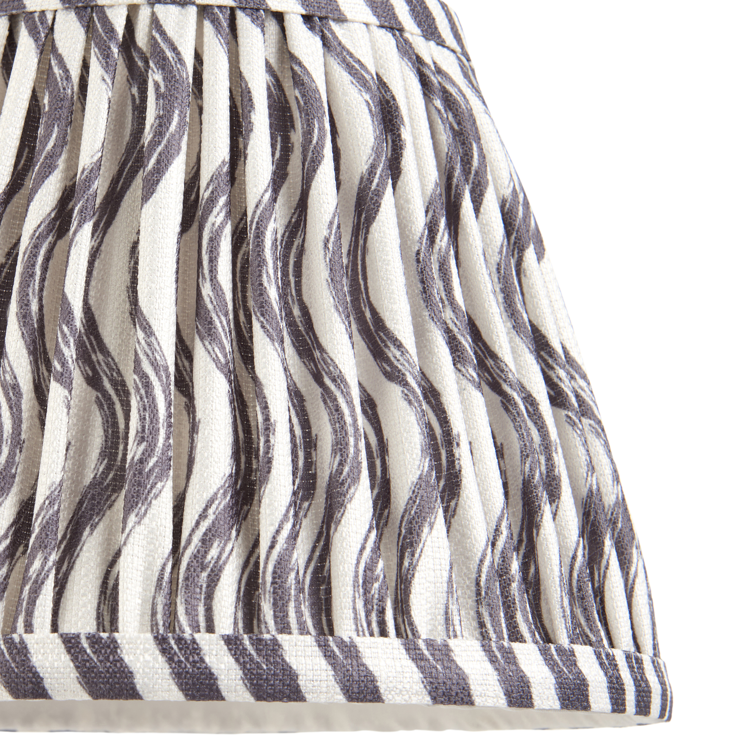 20cm tapered shade with white gimbal. Ripple pattern in pearl grey colour with taped edge detailing and plain inner lining. Perfect when paired with one of our beautifully decorative table lights, wall lights or chandeliers. Handcrafted 20cm tapered shade Gathered pleated design Digitally printed pearl grey faux linen fabric Taped edge detailing with plain inner lining Fixed gimbal, suitable for both table & pendants