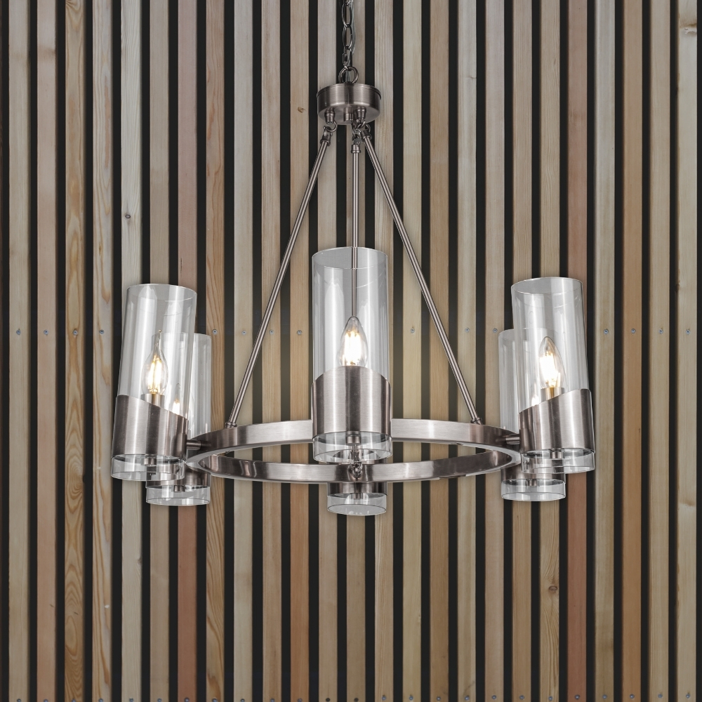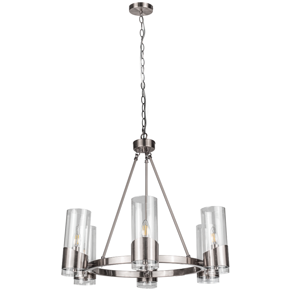 Elevate your space with the Rossa 6 Light Pendant in Satin Chrome, a modern lighting fixture blending sleek design with contemporary sophistication. Its satin chrome finish exudes elegance, creating a captivating centerpiece for any room. With six radiant lights, it casts a clean glow ideal for dining rooms, kitchens, or any space needing modern illumination. The pendant seamlessly merges minimalist aesthetics with functional lighting, offering both style and practicality.