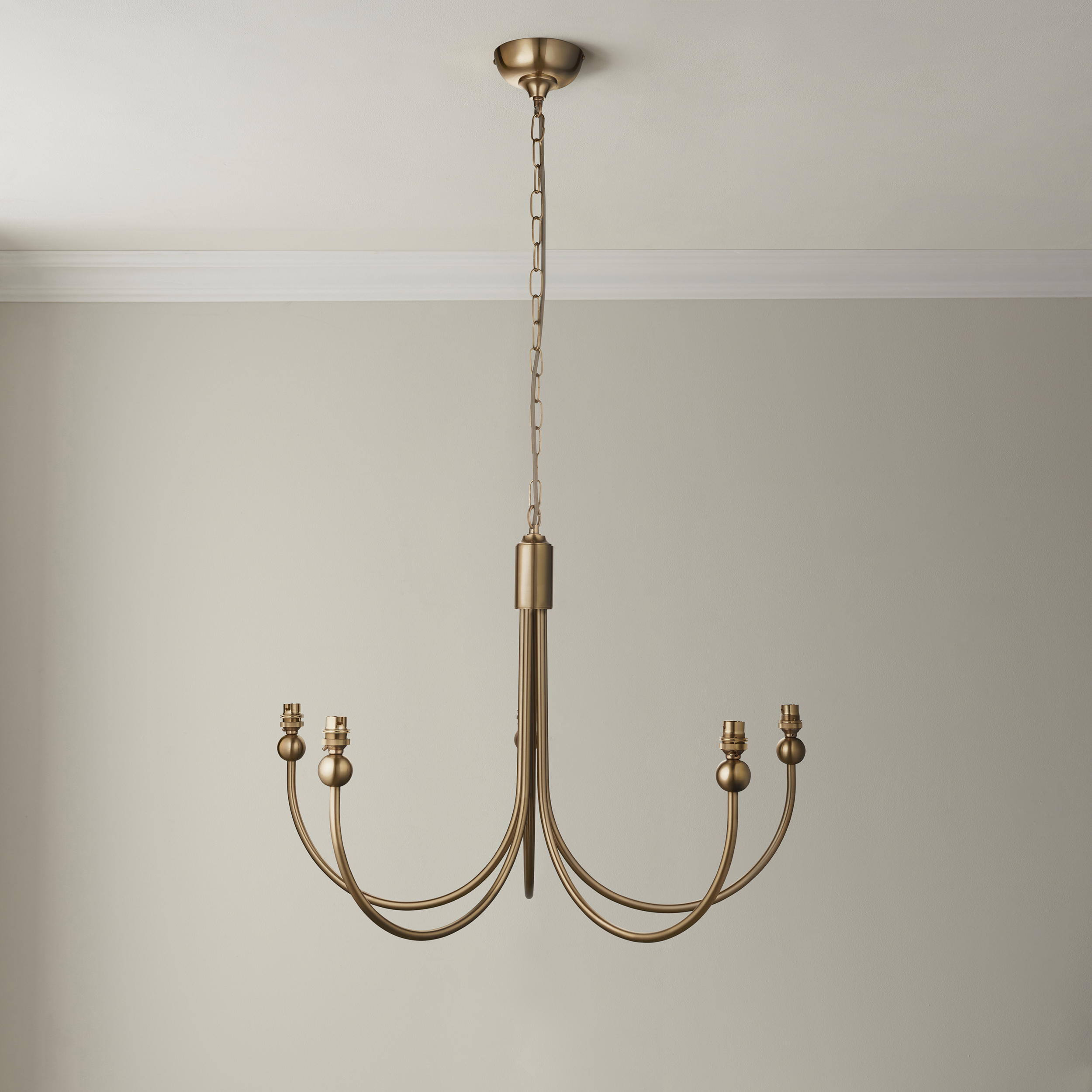 Inspired by classic designs from the past with a fresh new make-over. An elegant 5 light curved arm classic pendant fitting, finished in brushed aged brass, suspended from height adjustable 1.5m chain with grey braided fabric flex and featuring B22 lamp holders for an authentic feel. This is a fitting only pendant, pair with 5 of our 16cm or 20cm decorative fabric shades to complete the look. 5 light classic pendant Brushed aged brass plated Height adjustable 1.5 metre chain and grey fabric cable Authentic brass B22 lamp holders Dimmable Pair with one of our 16cm or 20cm decorative fabric shades Compatible with B22 LED lamps