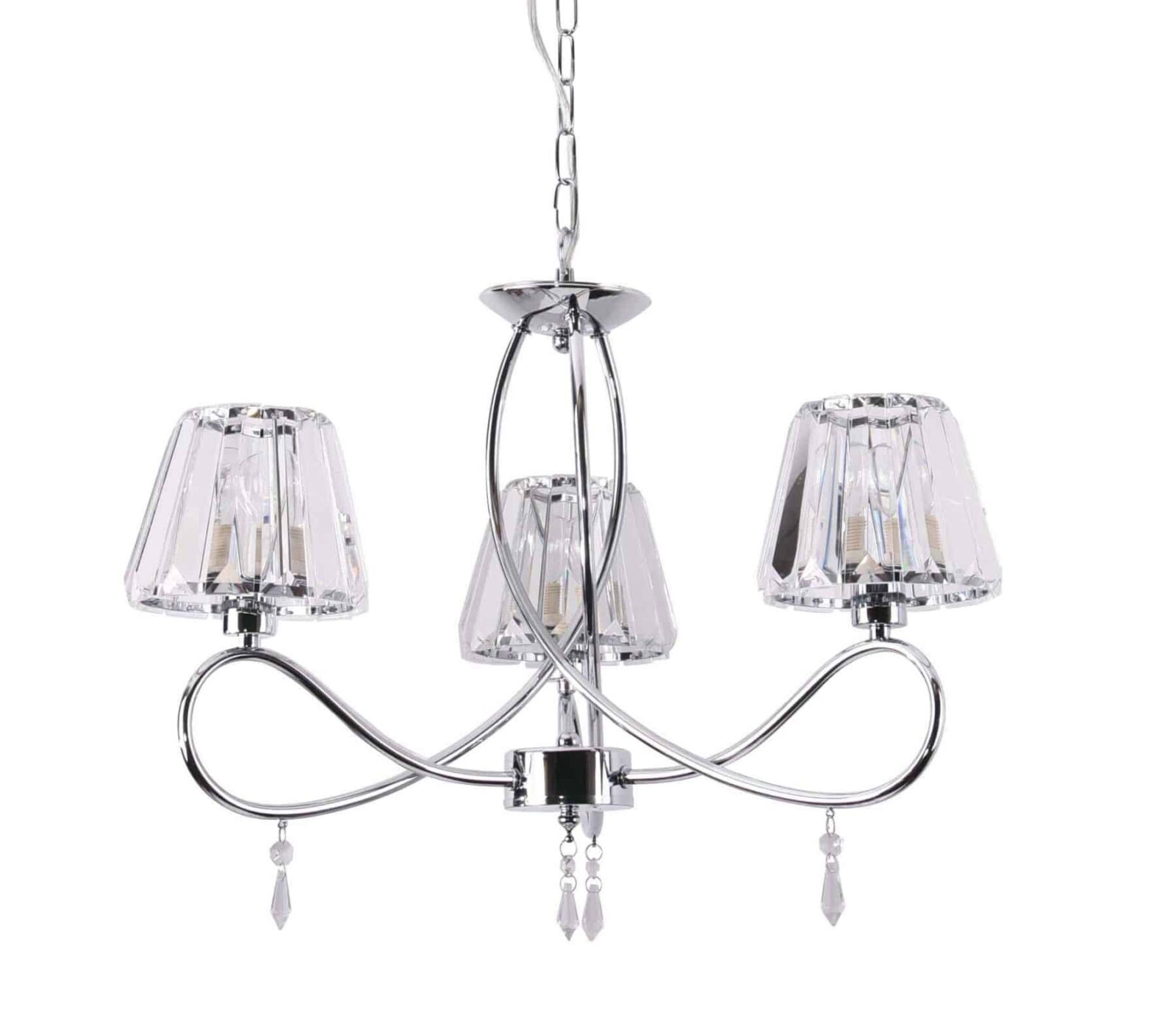 The Senza 3 Light Ceiling fitting is finished in Polished Chrome and features decorative crystal glass shades which create a beautiful sparkling effect when illuminated.  Each curved arm of the Senza is adorned with a delicate crystal droplet.  The Senza range also comes in a 5 Light version, single pendant, Wall Light, Table Lamp and an Antique Brass finish.