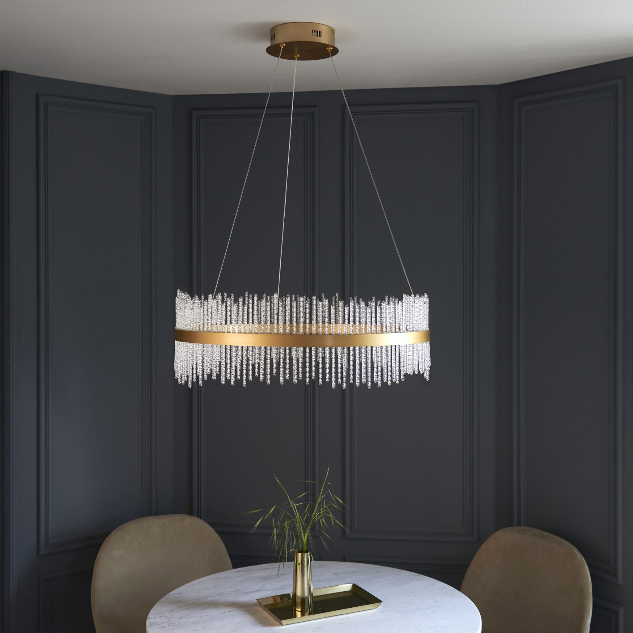 | Colour Finish | Brushed gold plated finish & clear glass |