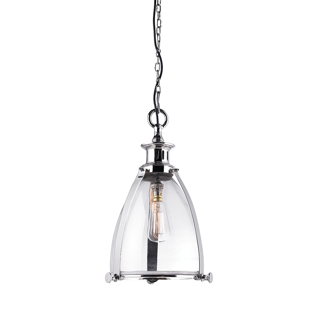 Medium timeless glass pendant, framed by metal banding with classic details in a smart polished nickel finish. Small pendant also avaliable. Timeless classic styling Polished nickel with clear glass High quality cast details Perfect for use with filament E27 LED lamps