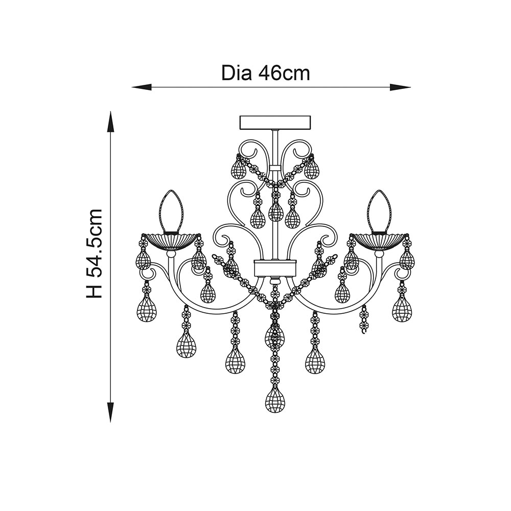 The Tabitha 3 light semi flush ceiling fitting is finished in a chrome effect plate with clear crystal glass detail and droplets. IP44 rated so suitable for use in the bathroom, dimmable and suitable for use with LED lamps. Matching items available