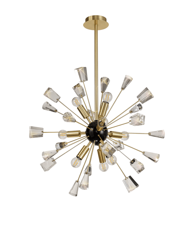 Trend Pendant Sputnik, 9 Light E14, Brushed Gold & Gloss Black/Crystal A sputnik composition is used to form the Trend range with long thin stems protruding from the central orb frame. The tip of each arm is adorned with a substantial block of high quality crystal cut into cones and glass trapezoids. The light from the E14 lampholders refracts across the crystals and glass for a brilliant effect. Both the flush 6 light and pendant 9 light are available in either a brushed gold and gloss black finish or polished nickel.
