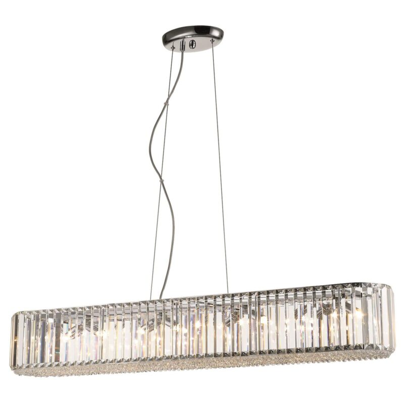Trinity Eight Light Linear Pendant Luminaire In Chrome And Clear. A touch of glitz and glamour as hanging crystals embellish the room with delicate droplets of light.  Tapered upright crystals form the outer shade.Trinity is available in various sized pendants, ceiling and wall lights