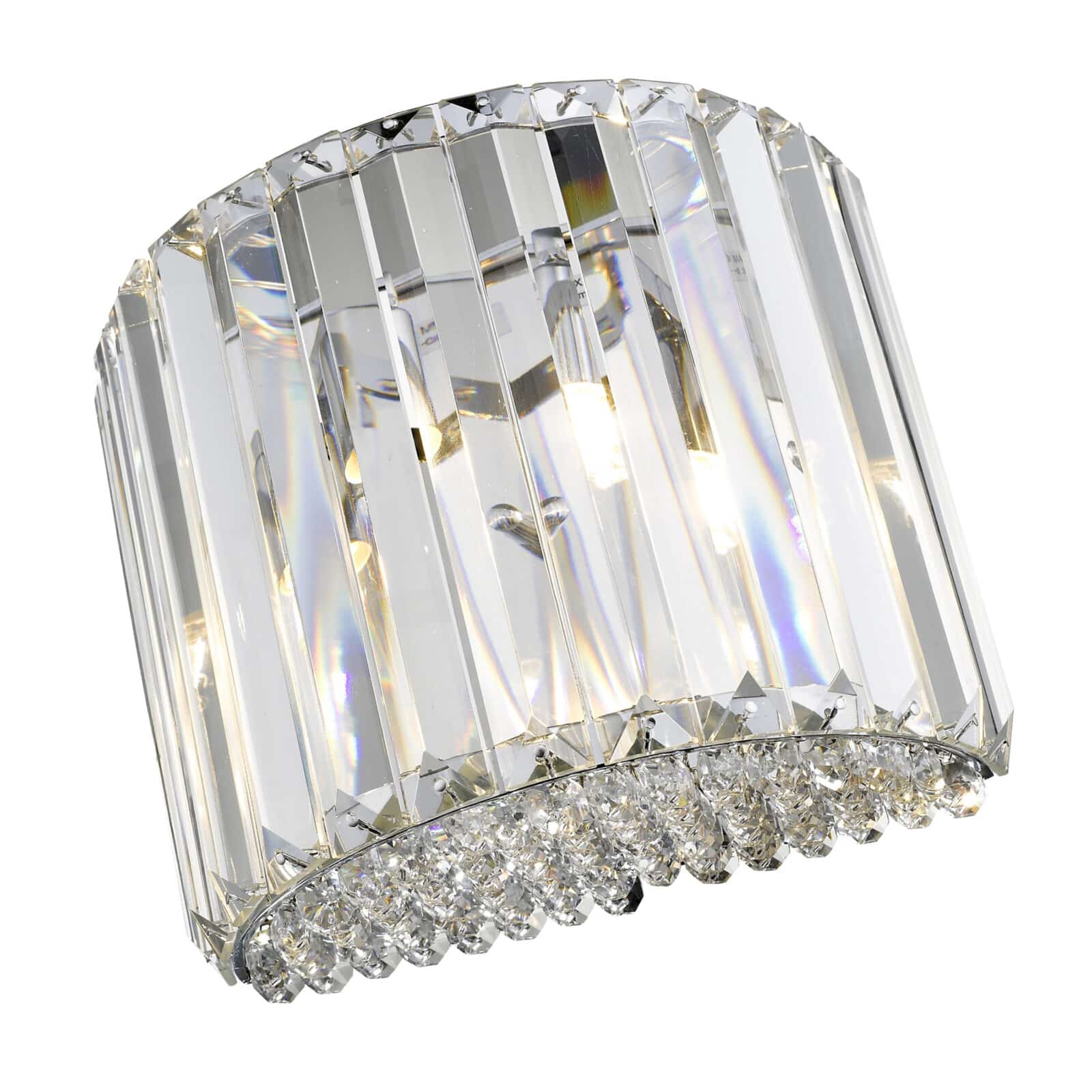 Trinity Wall Light. Wall Luminaire In Chrome And Clear. A touch of glitz and glamour as hanging crystals embellish the room with delicate droplets of light. Tapered upright crystals form the outer shade.Trinity is part of a vast collection of flush ceiling lights and various sized pendants