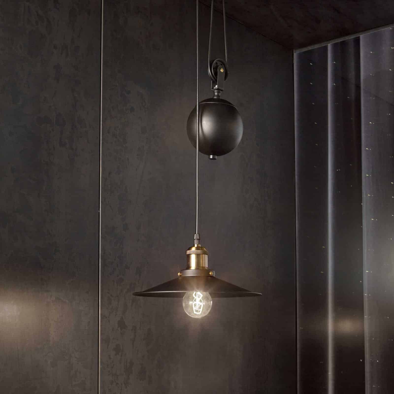 Up and down sp1 Black/Antique Brass. Metal frame with matt black enamel finish. Antique brass metal lamp socket covers and screws. Diffusers can be individually adjusted by means of a counterweight system.