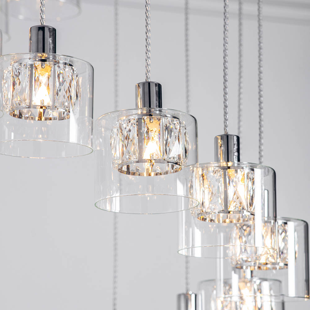 High quality clear crystals adorn this deluxe chrome plated multi pendant, the crystal shades are enclosed by beautiful clear glass diffusers, each suspended on height adjustable clear flex. The combination of clear crystals, polished chrome and glass create a luxurious interior decorative pendant light. Dimmable Chrome plate & clear glass Constructed from steel & glass