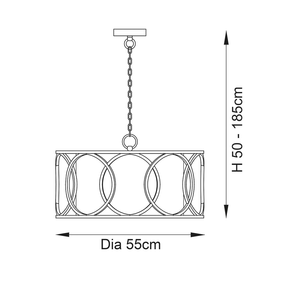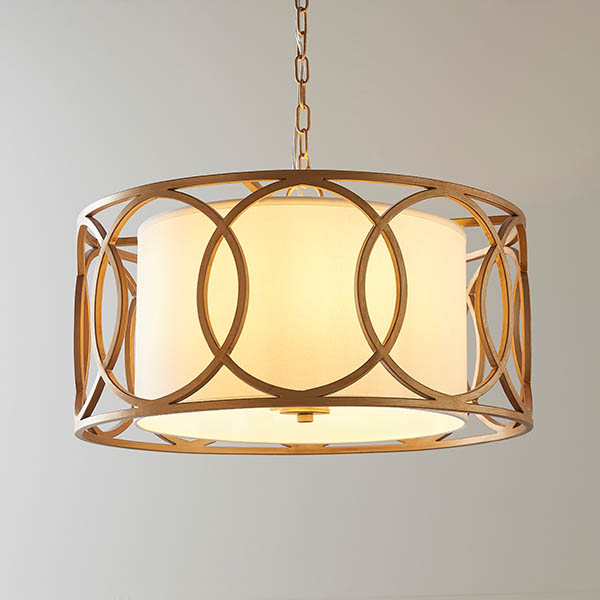 Victor Pendant. Interlinked rings finished in brushed gold create a decorative frame around the central white fabric shade for a timeless classic look.