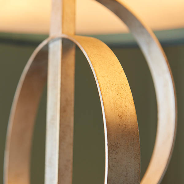 Reflecting a boutique hotel aesthetic. This pendant features two interlinked hoops and a luxurious satin drum shade. Available as a five or three light pendant in antique gold or silver leaf and with mink or teal fabric shade. Combine with matching items from the same range for a coordinated look.