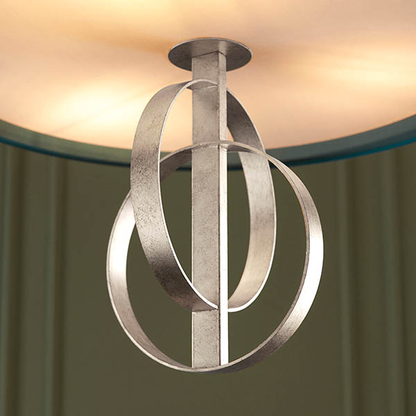 Reflecting a boutique hotel aesthetic. This pendant features two interlinked hoops and a luxurious satin drum shade. Available as a five or three light pendant in antique gold or silver leaf and with mink or teal fabric shade. Combine with matching items from the same range for a coordinated look.