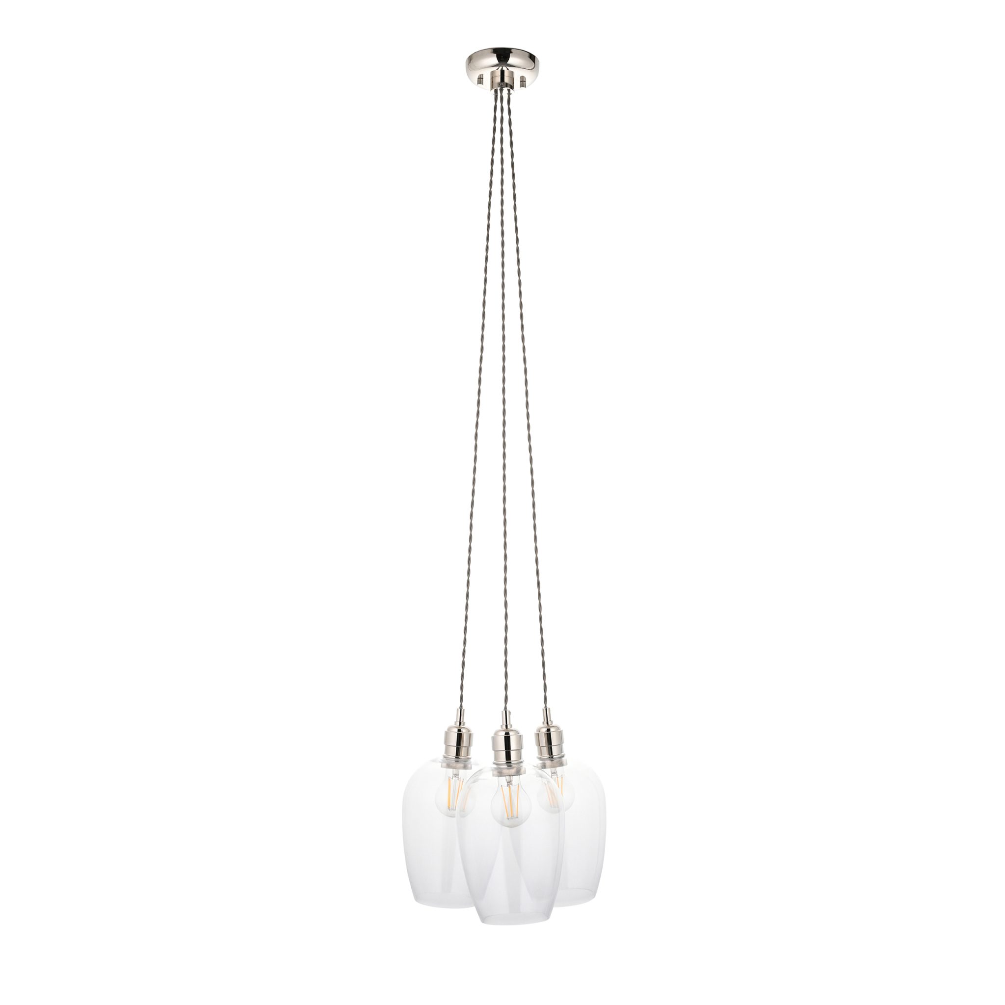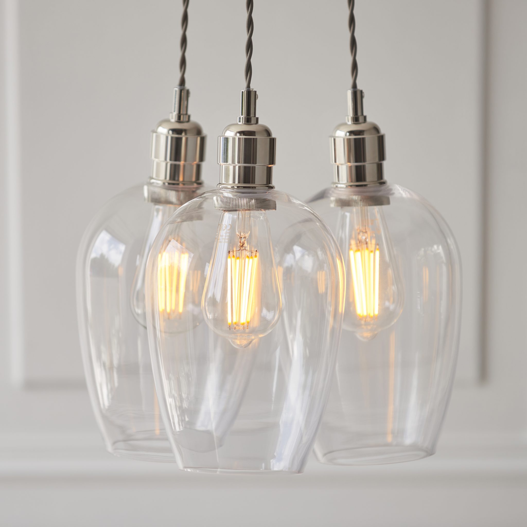 Winifred Pendant. Seven High-quality clear blown-glass shades meet polished nickel plated metalwork, with height-adjustable 1m twisted grey fabric cables and full dimming, best paired with E27 LED filament lamps for that uniquely on-trend glow.